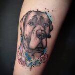 Vzpomínkové tetování psa s květinami a jménem, zvíře na lýtko
