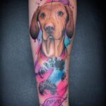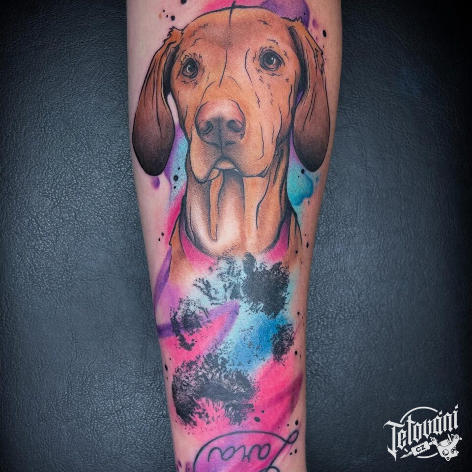 Vzpomínkové tetování s nápisem, zvíře pes, psí tlapka, jméno na předloktí