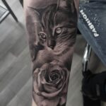 Vzpomínkové tetování, zvíře kočka, květina růže, portrét na předloktí