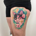 Vzpomínkové tetování zvíře kočka, květiny na bok stehna