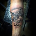 Vzpomínkové tetování zvíře kočka, nápis jméno na předloktí