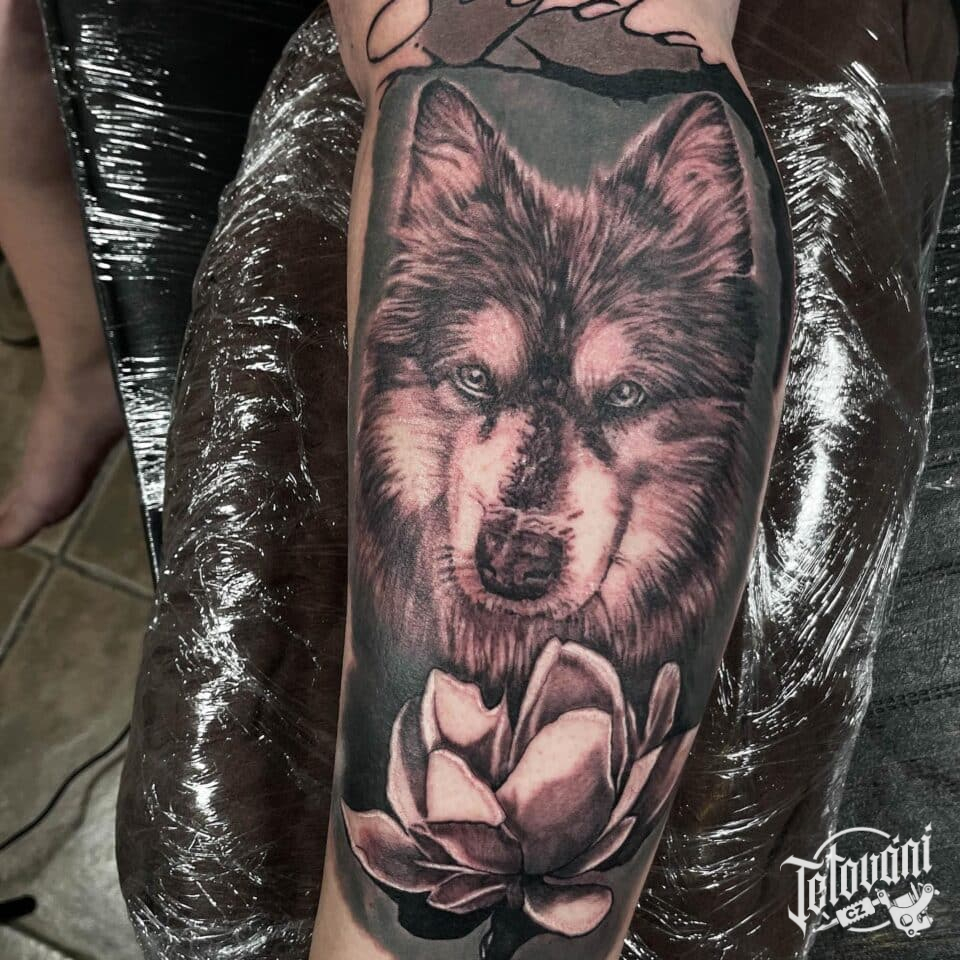Vzpomínkové tetování zvíře pes a lotos, květina na paži