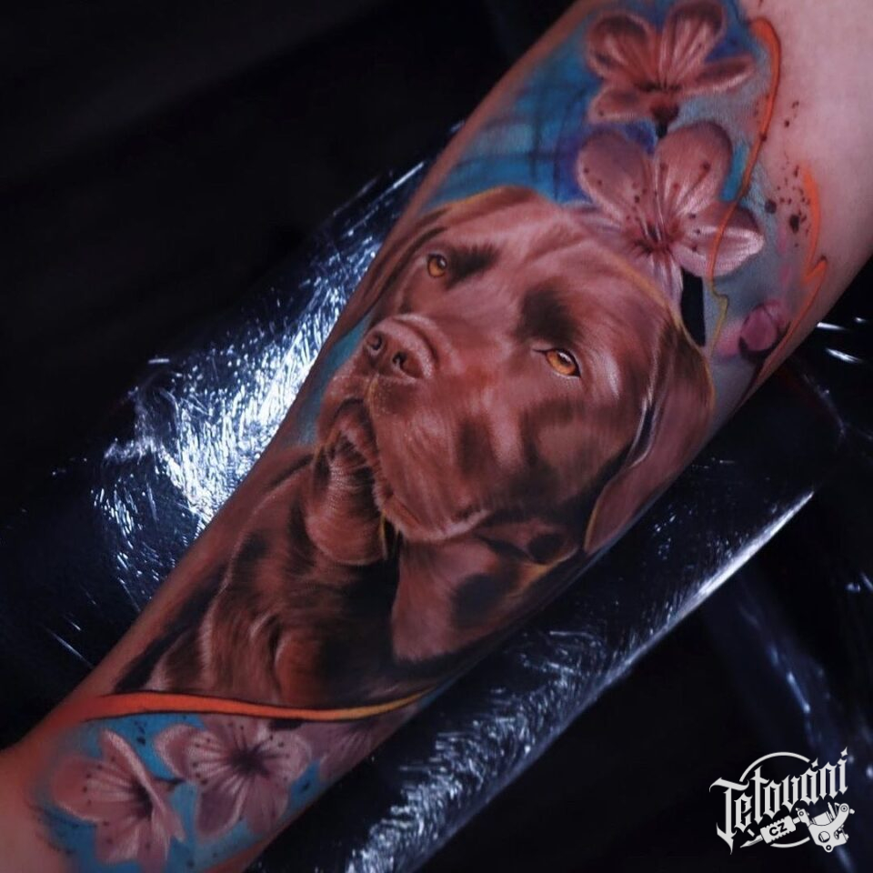 Vzpomínkové tetování, zvíře pes , květina, Lilie na předloktí