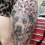 Vzpomínkové tetování zvíře pes, mandala na stehno