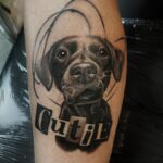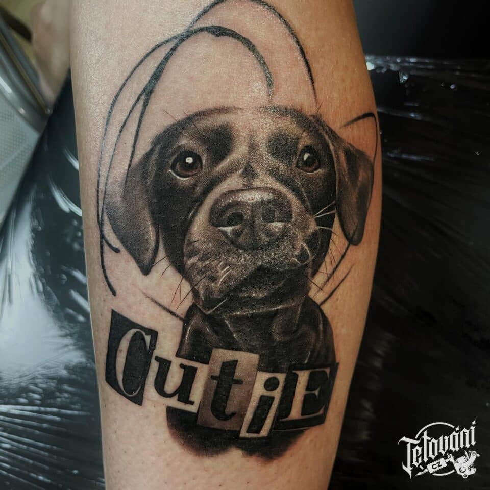 Vzpomínkové tetování zvíře pes, nápis na lýtko