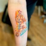Vzpomínkové tetování, zvíře pes, portrét se jménem a korunou na předloktí