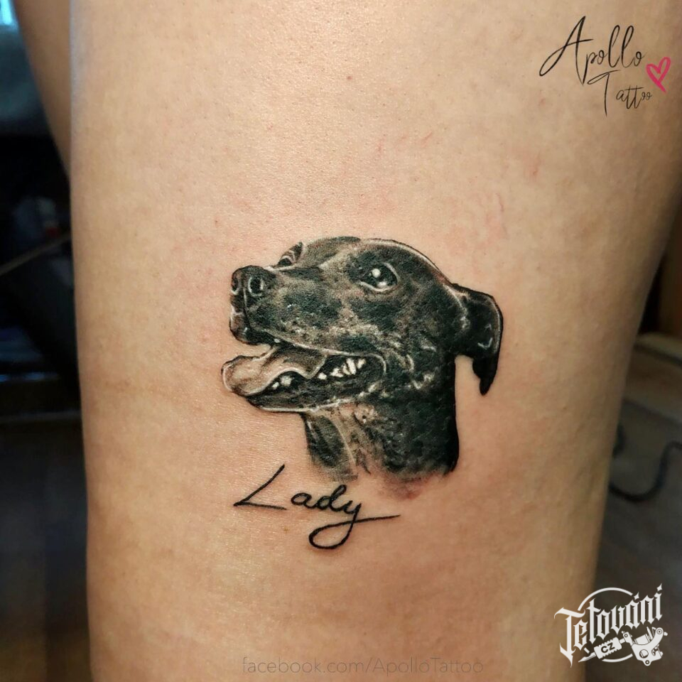 Vzpomínkové tetování zvíře pes, portrét se jménem na stehno
