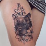 Vzpomínkové tetování zvíře pes s květy na stehno