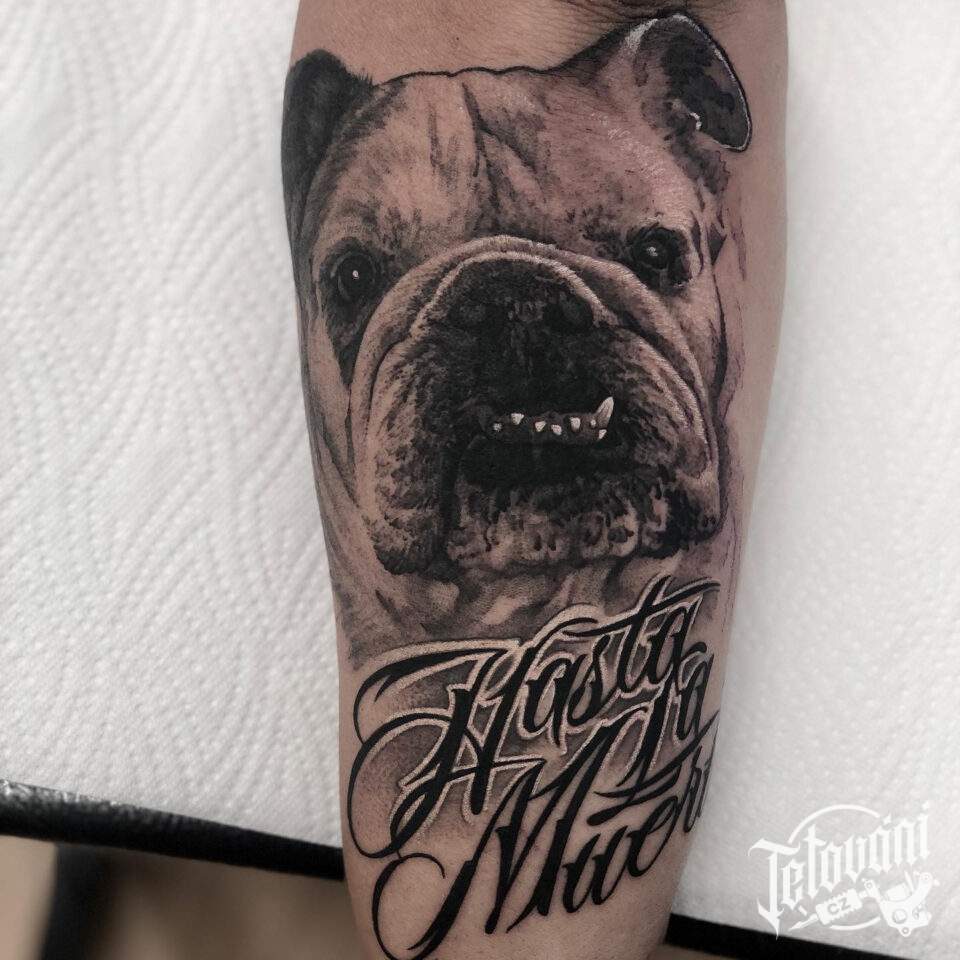Vzpomínkové tetování zvíře pes s nápisem na předloktí
