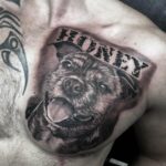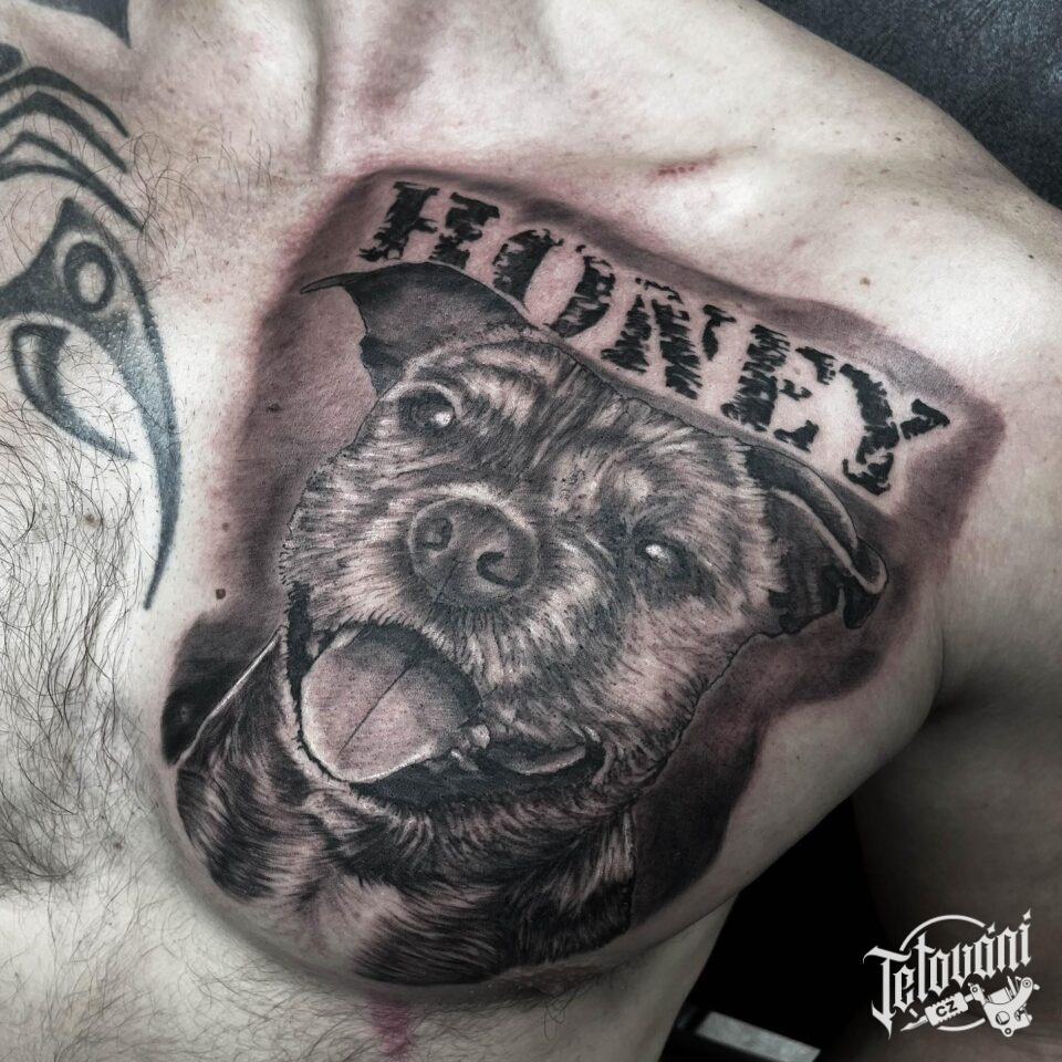 Vzpomínkové tetování zvíře pes se jménem na hrudník