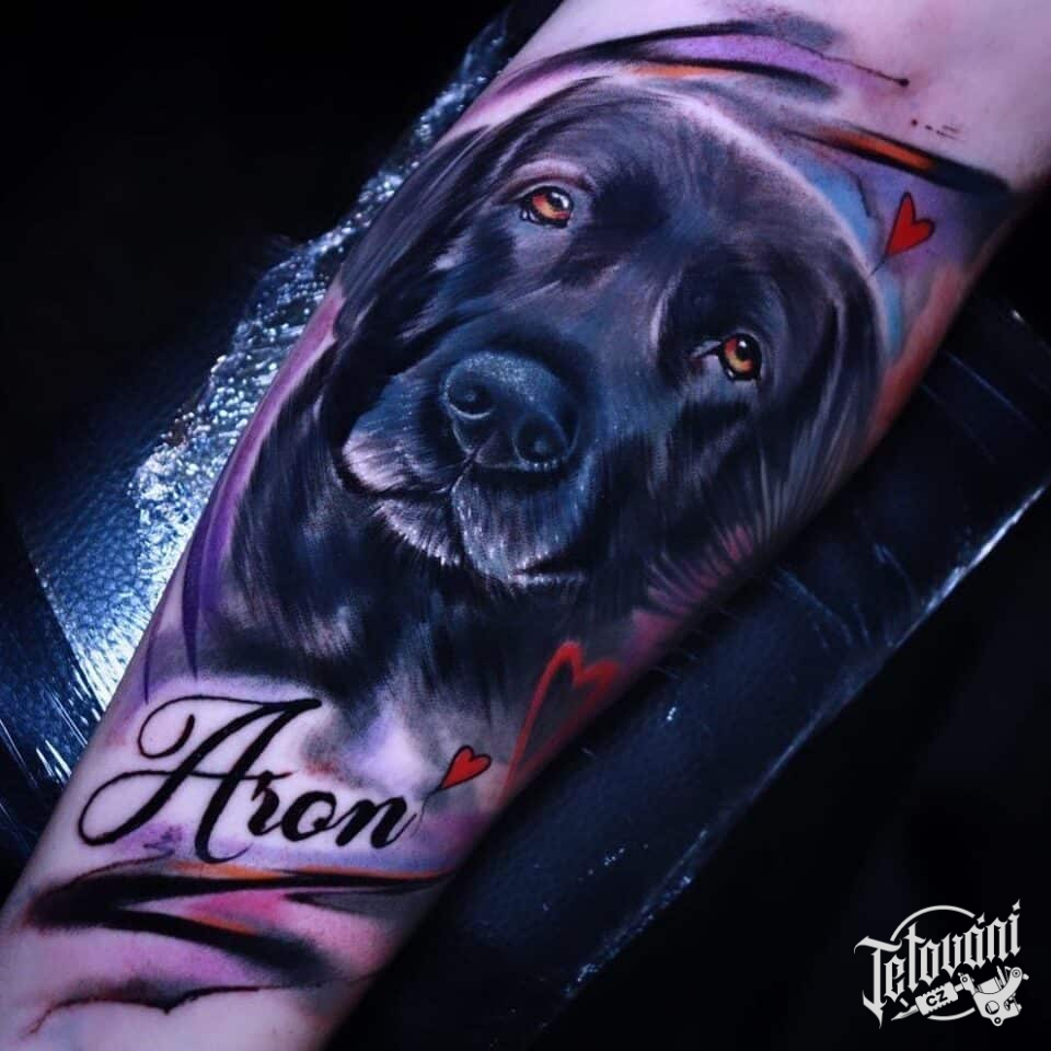 Vzpomínkové tetování zvíře pes se jménem na předloktí