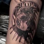 Vzpomínkové tetování zvíře pes se jménem na stehno